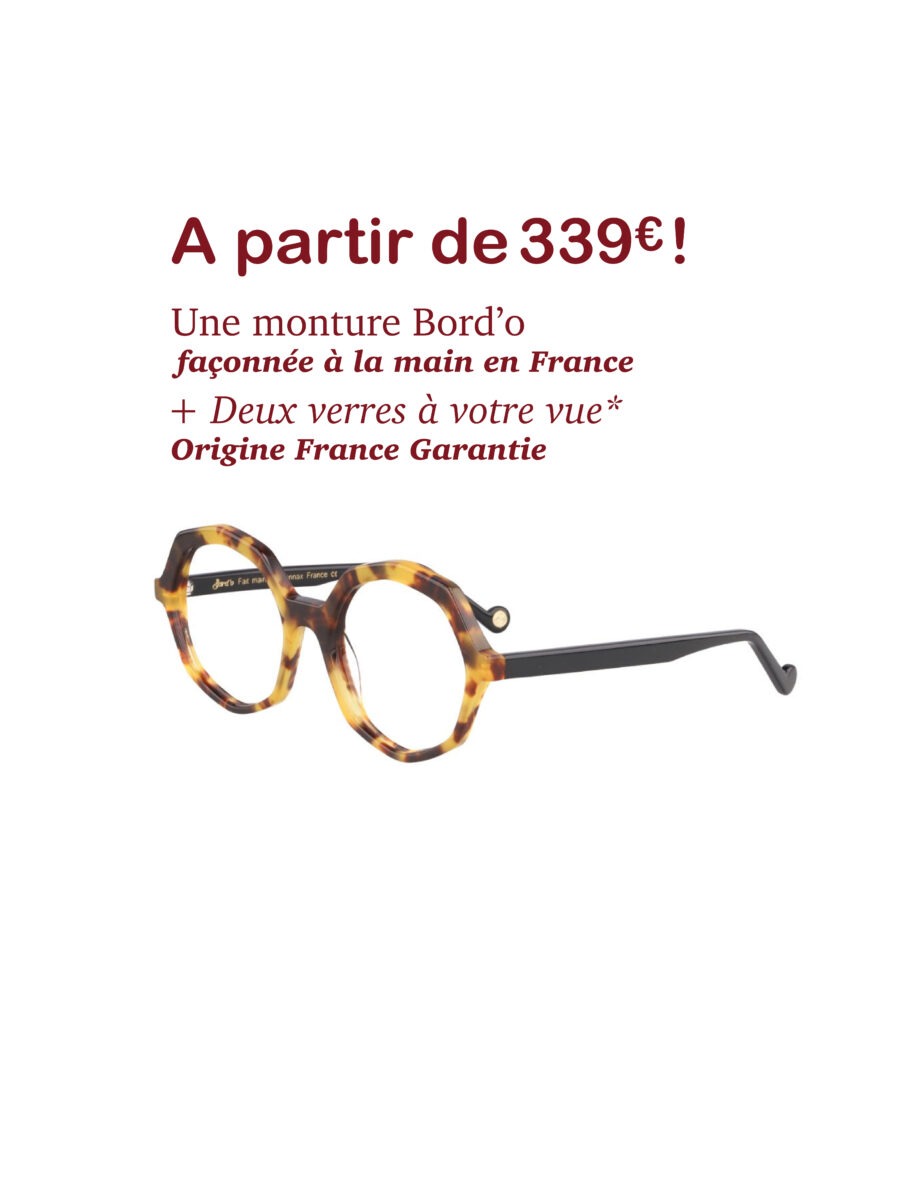 *Tarif valable pour une monture optique Bord’o au choix + verres unifocaux, -6,00 à +4,00 cylindre 2. Possibilité d’extension sur verres progressifs. Offre cumulable avec une “2ème paire offerte”. Hors forfaits et promotions. Voir conditions en magasin.
